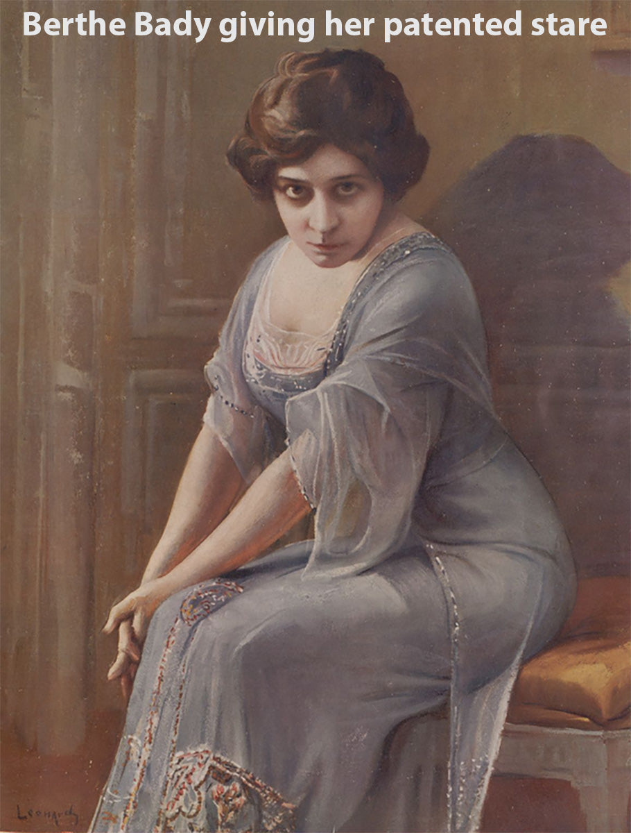 The dramatic confrontation between Marcel (played by Lugné-Poé) and Jeanne (played by Berthe Bady) is drawn by Lautrec to maximum effect. The confrontation centers around the idea that Marcel projects artistic ideals of beauty onto Jeanne, who wishes to remain her own person, rather than a frozen image rendered by an artist. Bady’s face is turned away from us, forcing us to imagine her ire from the fright depicted in Lugné-Poé’s facial expression and demeanor. He is so scared he seems to have recessed into the wall. His face suggests anger on a level he has never experienced before. Berthe Bady could give a stare, obviously (see our last image)! Toulouse-Lautrec’s expressive linework is here at its very best.