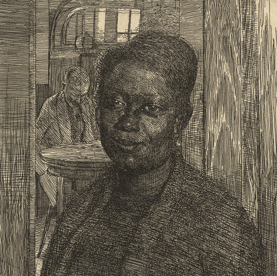Monogrammed "ML" in the plate, lower right corner. Also dated "Juin 1935" and annotated "Létra" (or perhaps Létza) in the lower left plate edge. On the verso, annotated "Celestine Grosnard". We were unable to tie any of these names or references to any artist or sitter.